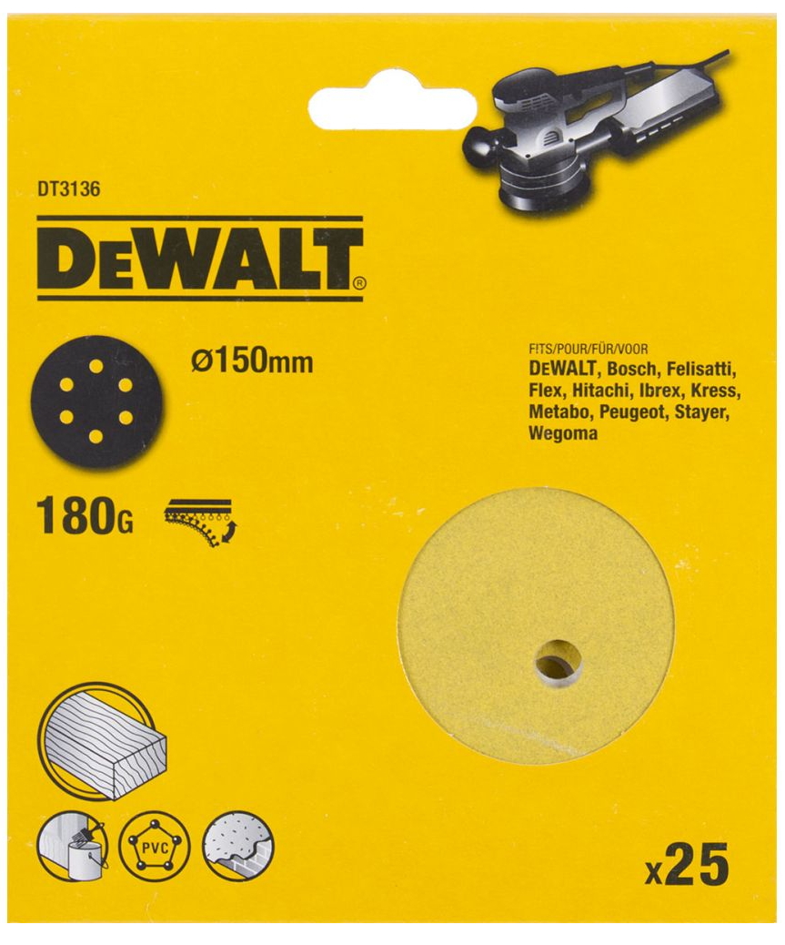 Шлифкруги 150мм 6 отверстий 180G, 25шт DEWALT DT3136-QZ